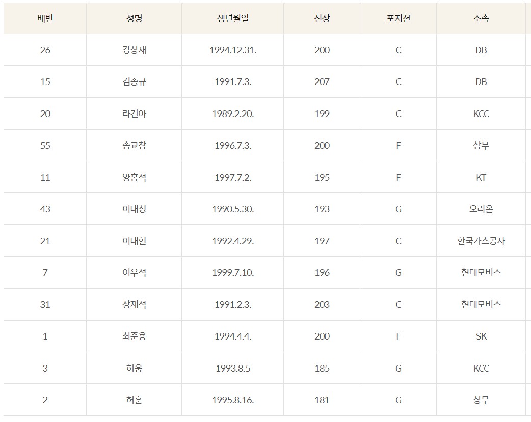 센터 - 라건아(199cm) , 강상재(200cm), 김종규(207cm), 이대헌(197cm), 장재석(204cm)