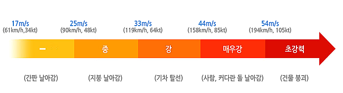 최대풍속이 54m/s 이상이면 초강력 태풍으로 분류됨