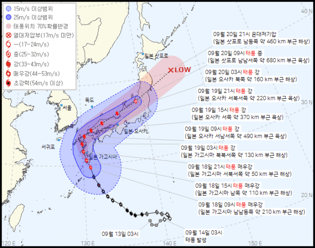 태풍 ‘난마돌’은 18일 오전 9시 기준 일본 가고시마 남동쪽 약 210km 부근 해상에 위치하고 있으며, 중심기압은 935헥토파스칼(hPa), 최대풍속 초당 49미터로 태풍 세력은 ‘매우 강’을 유지하고 있고, 내일 새벽부터 오후까지 우리나라에 영향을 미칠 것으로 전망되고 있다.