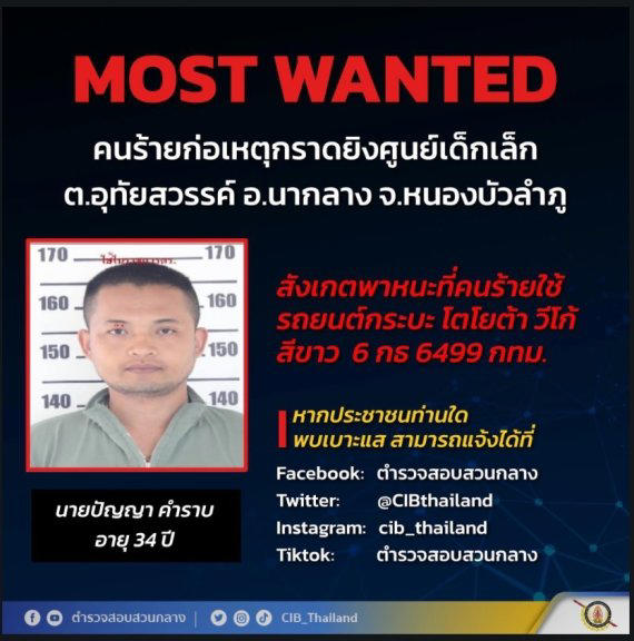 태국 경찰 당국은 전직 경찰관을 용의자로 지목, 추적하고 있다고 밝혔다. 현지 경찰은 전직 경찰관인 파냐 캄랍(34)을 용의자로 지목했다. 다만 이 용의자는 범행 직후 부인과 자녀를 살해하고 스스로 목숨을 끊은 것으로 알려졌다.