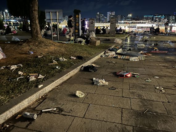 서울시에 따르면 대규모 불꽃축제가 열린 이튿날인 이날 오전 여의도·이촌 한강공원의 쓰레기 수거량은 50t으로 집계됐다. 코로나19 사태 이전 마지막으로 열린 2019년 행사 당시 45t과 비교하면 11%가량 늘어난 것이다. 주최사인 한화는 전날 대략 105만 명이 여의도 행사장과 인근 지역에서 축제를 즐긴 것으로 추산했다. 100만 명이 모인 2019년과 비교하면 관람객 수와 쓰레기 배출량이 모두 증가했다.