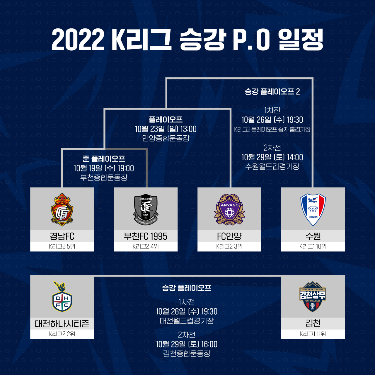 수원이 10위(승점 44), 김천 상무가 11위(승점 38)로 2부 팀과 승강 PO를 치른다. 김천은 K리그2 11위인 대전 하나 시티즌과, 수원은 K리그 2 PO 승리 팀과 26일, 29일 두 차례 맞붙는다. 탄천 종합운동장에선 성남과 대구가 8골을 주고받는 난타전 끝에 무승부를 거뒀다. 성남 FC(승점 30)는 일찌감치 최하위를 확정했다.