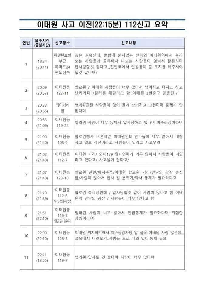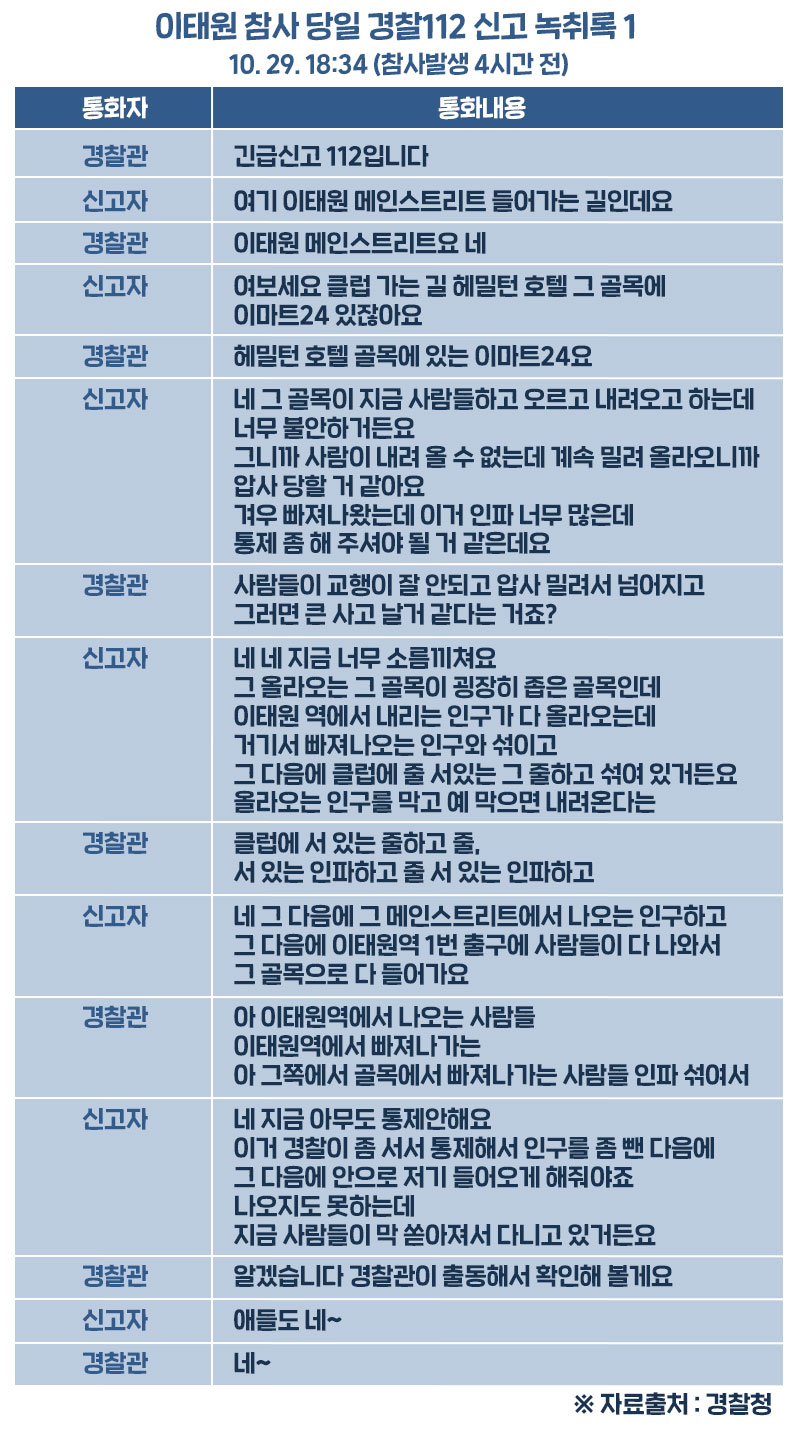경찰이 공개한 29일 사고 당일 이태원 파출소에 걸려온 인파 통제 관련 112 신고 11건의 녹취록을 보면 경찰은 오후 6시 34분 첫 신고를 접수한 것으로 확인됐다. 당시 신고는 이태원 해밀톤호텔 부근 이마트 24 편의점 쪽이었다. 신고자는 “좁은 골목인데 클럽에 줄 서 있는 인파와 이태원역에서 올라오는 사람들, 골목에서 나오는 사람들이 엉켜서 잘못하다 압사당할 것 같다”며 “진입로에서 인원 통제 등 조치를 해주셔야 될 것 같다”라고 말한 것으로 파악됐다.