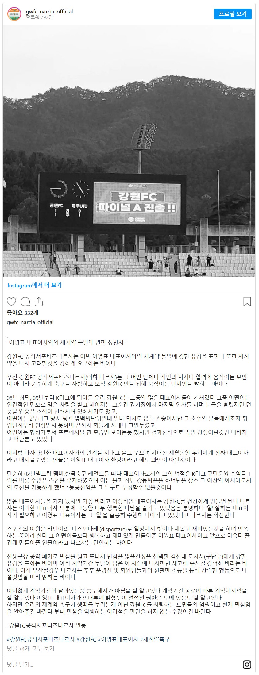 강원 구단의 공식 서포터스 ‘나르샤’는 성명서를 통해 “이영표 대표이사와 재계약 불발에 강한 유감을 표했다.