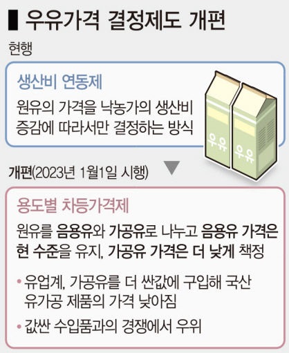 농식품부는 내년 1월부터 원유 용도별 차등가격제를 시행하기로 했다. 차등가격제가 도입되면 음용 유용 원유 가격은 농가의 생산비와 시장 상황도 함께 고려한다. 그간 생산비만을 기준으로 책정해왔던 것과는 달리 수요 등을 분석해 원유가에 반영할 계획이다.