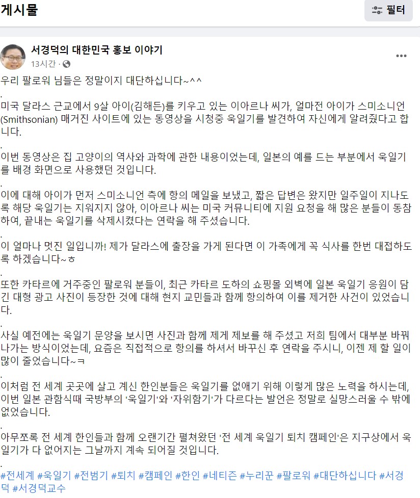 서 교수는 “아이가 먼저 스미스소니언 측에 항의 메일을 보냈고 “알려줘서 고맙다”는 짧은 답변은 왔지만 일주일이 지나도록 욱일기가 지워지지 않았다”며 “이후 어머니 이 아르나 씨가 미국 커뮤니티에 지원 요청을 해 많은 분이 동참해주셨고 끝내 욱일기는 삭제됐다”라고 말했다.