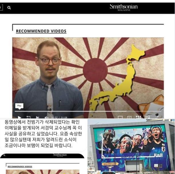 한 줄 요약 : 서경덕 교수가 한인 초등학생이 스미스소니언 박물관 사이트에 게재된 영상 속 욱일기를 발견하고 삭제를 요청한 내용을 공개했고, 이 영상은 삭제 되었다.