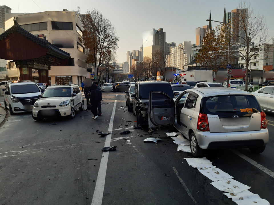 9일 오전 8시 21분쯤 대구 중구 서성네거리에서 11중 추돌사고가 났다는 신고가 119에 접수됐다. 소방 당국에 따르면 이 사고로 경상자 15명이 발생했다. 허리와 관절 통증 등을 호소하는 5명은 병원으로 이송됐다.