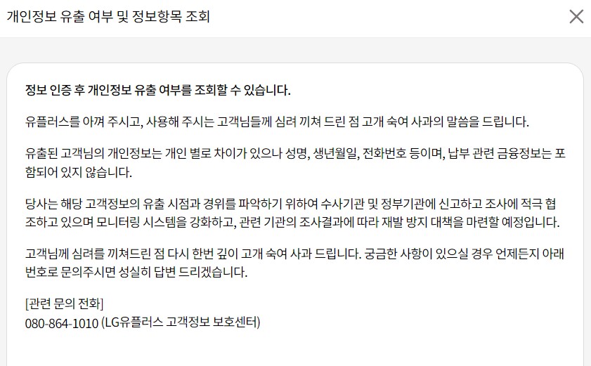 LG유플러스는 홈페이지를 통해 "일부 고객의 개인 정보가 유출된 사실을 인지했다"라면서 "소중한 정보가 부적절하게 이용될 수 있으니 유의해 주시길 바란다"라고 공지했다.