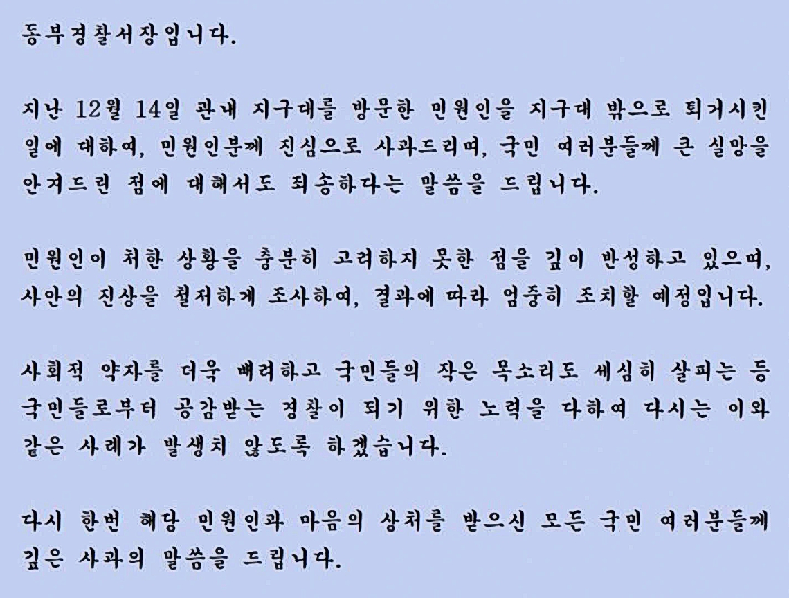 부산 동부경찰서는 홈페이지에 사과문을 올리고 “관내 지구대를 방문한 민원인을 지구대 밖으로 퇴거시킨 일에 대하여 민원인분께 진심으로 사과드린다”면서 “국민 여러분께 큰 실망을 안겨드린 점에 대해서도 죄송하다는 말씀을 드린다”라고 밝혔다.