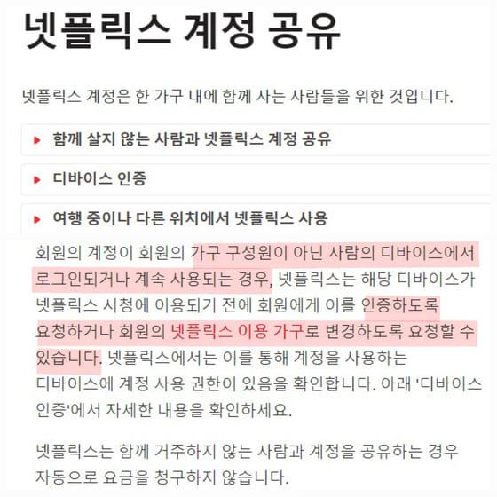 한 줄 요약 : 넷플릭스가 한국에서도 계정 공유 단속에 나설 것이라면서 가족 이외의 디바이스에서의 계정공유를 금지하겠다고 밝혔다.