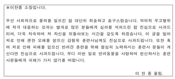 이 소장은 법률대리인을 통해 “무고 행위에 대응하는 것과는 별개로 많은 분에게 심려를 끼친 점 진심으로 사과한다”며 “나로 인해 괜한 오해를 받으신 강형욱 훈련사에게도 진심으로 사과한다”라고 전했다.