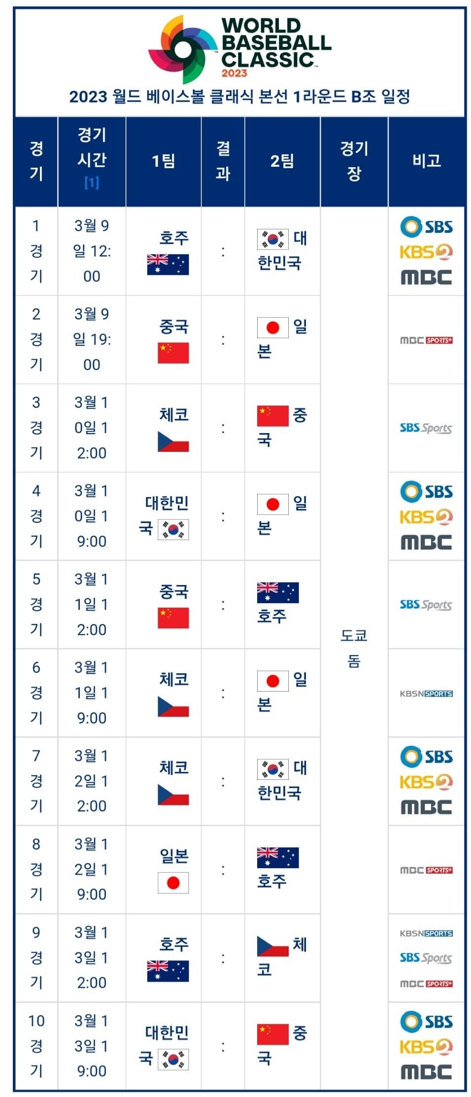 1경기 : 2023. 3. 9 (목) 12:00 호주 VS 대한민국