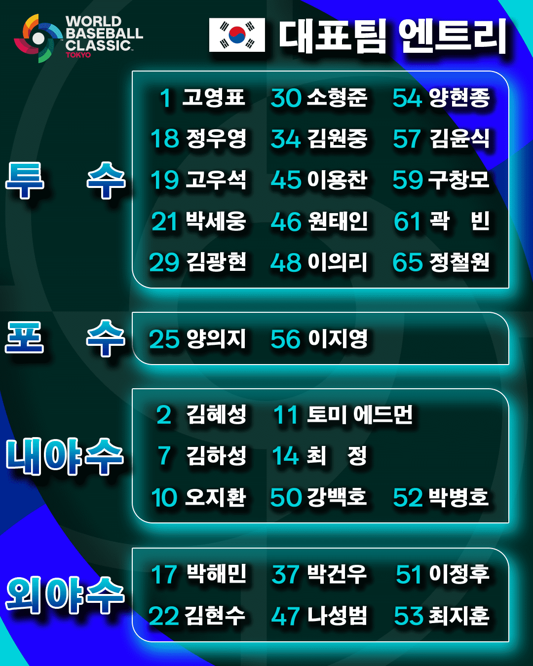 외야수 - 이정후(키), 김현수(L), 박해민(L), 나성범(K), 박건우(N), 최지훈(S)