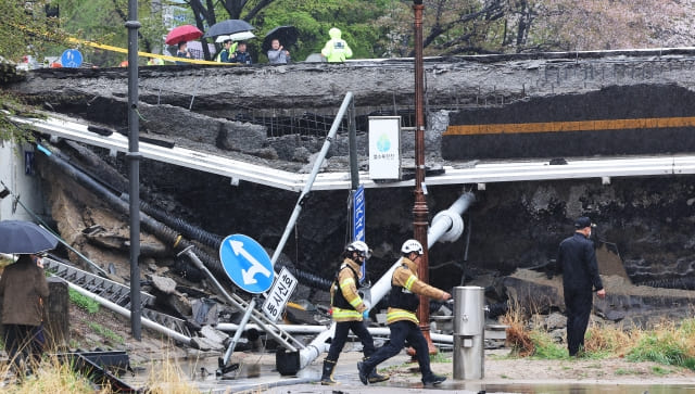 이날 오전 9시 45분쯤 성남시 분당구에 위치한 정자교 중 보행로 일부가 탄천 아래로 무너져 내렸다. 무너져 내린 보행로는 교량 아래 탄천 산책로와 자전거도로를 완전히 가로막은 채 바닥으로 내려앉았고, 도로 표지판과 신호등은 엿가락처럼 휘어졌다.