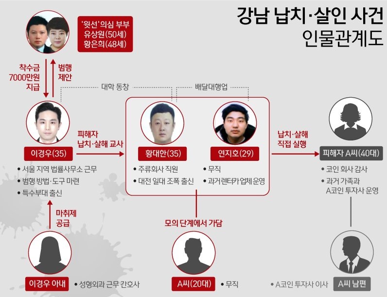 유상원과 황은희는 지난달 29일 벌어진 강남 납치 살인 사건의 주범 이경우에게 범행을 사주한 혐의를 받고 있다. 경찰은 유상원과 황은희가 착수금 2000만 원이 포함된 7000만 원을 이경우에게 건넨 것으로 의심하고 있다.