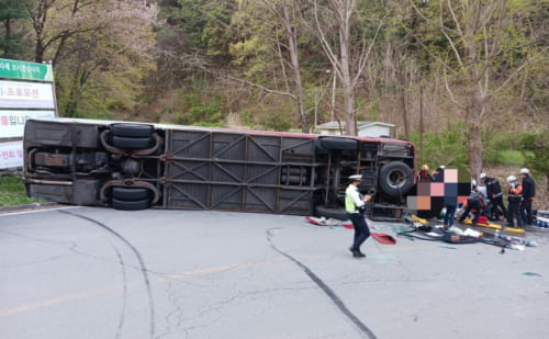 충북 충주시 수안보면 한 도로에서 외국인들을 태운 관광버스가 전도되면서 35명의 사상자가 발생했다.
