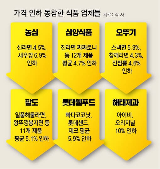 농심은 신라면과 새우깡 가격만 내렸고, 안성탕면, 짜파게티 등 인기 제품의 가격은 유지하고 있다. 삼양식품은 불닭볶음면, 오뚜기는 진라면, 팔도는 팔도비빔면 가격을 동결했다. 롯데웰푸드도 초코빼빼로와 꼬깔콘 등 가격은 조정하지 않았다.