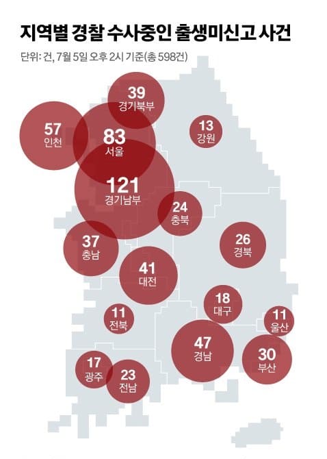 지난 4일 오전 193건으로 집계된 '출생미신고 아동' 수사 건수는 이틀 만에 598건까지 불어나면서 향후 경찰 수사가 더 확대될 가능성이 커지고 있다.