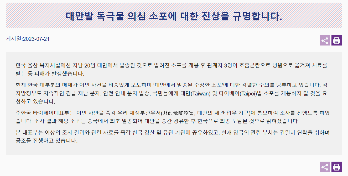 대표부는 이번 사건 관련 “현재 한국 대부분의 매체가 사건을 비중 있게 보도하며 ‘대만에서 발송된 수상한 소포’에 대한 각별한 주의를 당부하고 있다”며 “각 지방 정부도 국민들에게 대만 및 타이베이발 소포를 개봉하지 말 것을 요청하고 있다”라고 부연했다.