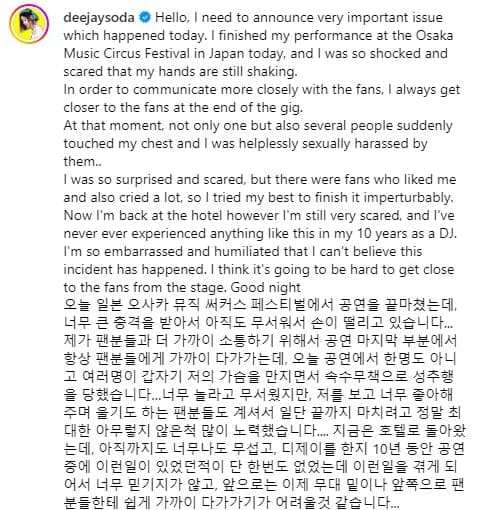 DJ소다는 지난 14일 일본 오사카 뮤직 서커스 페스티벌 중 소통을 위해 관객들에 다가갔다가 성추행을 당했다고 밝혔다. DJ소다는 “한명도 아니고 여러 명이 갑자기 제 가슴을 만지면서 속수무책으로 성추행을 당했다”면서 “지금 호텔로 돌아왔는데, 아직도 너무 무섭다. DJ를 한 지 10년 동안 이런 일이 단 한 번도 없었는데 믿기지 않는다. 앞으로는 무대 밑이나 앞쪽으로 팬분들한테 쉽게 가까이 다가가기가 어려울 것 같다”라고 말했다. 함께 공개된 사진에는 일부 남성 관객이 DJ 소다의 가슴을 만지는 모습이 담겼다.