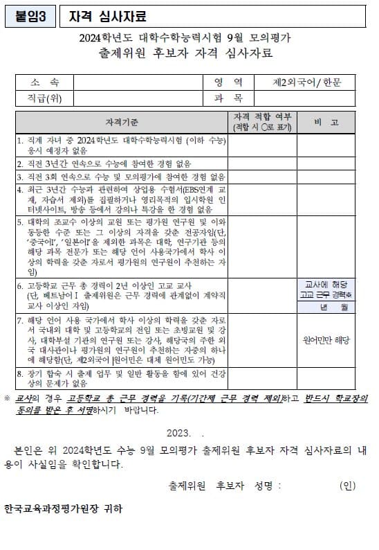 교육부는 수능시험의 공정성 제고를 위해 2024학년도 수능시험 출제진을 구성할 때 감사원과 협의해 사교육업체 문항 판매자를 철저히 배제하기로 했다. 또 올해 안에 내년 수능시험 및 모의평가부터 사교육업체 문항 판매자의 출제 참여를 원천 배제하는 제도 개선 방안을 마련한다.