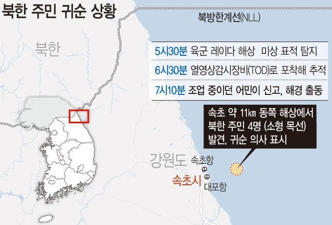 북한 주민 4명이 소형 목선을 타고 24일 아침 강원도 속초 동방 해상으로 귀순했다.