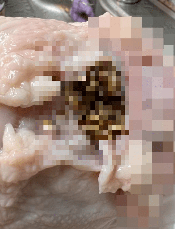 제보자는 “어제 오후 구입한 통닭을 오늘 아침 조리하기 위해 열어봤더니 생닭 목 부위에 뭉쳐진 지방 덩어리 같은 게 보였다”며 “께름칙해 지방을 제거하려고 뜯어보니 애벌레 수십 마리가 나오는 걸 보고 기겁을 했다”라고 상황을 설명했다.