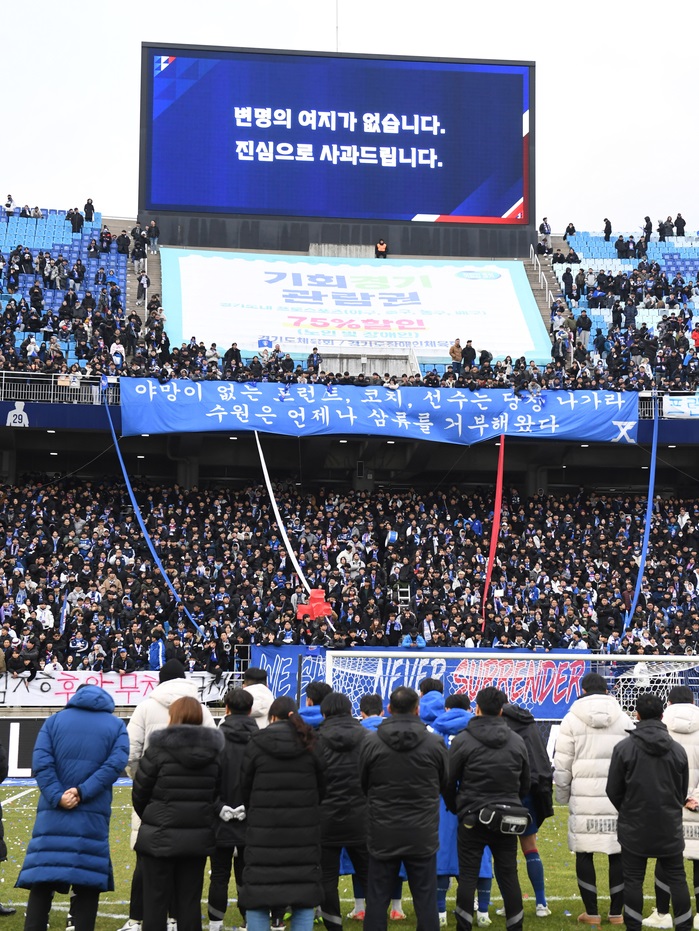 수원 팬들은 경기가 끝난 뒤 본격적으로 분노를 쏟아냈다. 이들은 선수단 버스 출구에 모여들어 일명 '버스 막기'에 돌입했다. 경기가 종료된 지는 벌써 2시간이 넘게 수원 팬들은 여전히 수원 선수단 버스 및 프런트 직원들과 대치 했다.