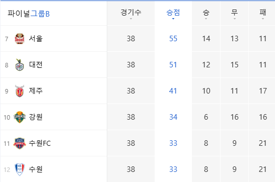 반면 수원FC와 강원은 가까스로 마지막 기회를 잡는 데 성공했다. 10위 강원은 김포와 경남 중 K리그2 플레이오프(PO) 승자와 승강 PO를 치르고, 11위 수원FC는 K리그2 2위 부산과 PO에서 운명을 걸고 맞붙는다.