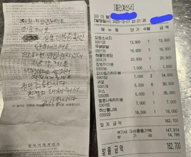 이들이 먹은 것으로 보이는 영수증에는 무뼈 닭발과 해물 짬뽕탕 등 안주류와 주류를 모두 합쳐 16만 2700원의 금액이 찍혔다.