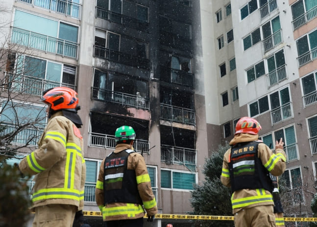 소방 당국에 따르면 이날 화재로 숨진 30대 남성 중 한 명은 불이 난 3층 아파트의 바로 위층에 살고 있었다. 아내와 0세·2세 아이들과 사는 이 남성은 불이 나자 아내와 함께 아이들을 한 명씩 안고 4층에서 뛰어내린 것으로 알려졌다.
