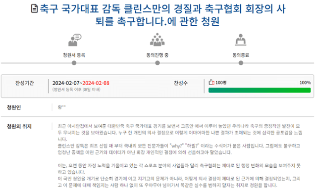 국회 국민동의청원 사이트에 따르면 한 축구팬이 작성한 것으로 보이는 ‘역대급 황금세대로 구성된 대한민국 축구 국가대표팀을 ‘뻥’ 축구, ‘해줘’ 축구, ‘방관’ 축구로 아시아를 놀라게 한 클린스만 감독의 경질에 관한 청원’이라는 제목의 청원이 올라왔다.