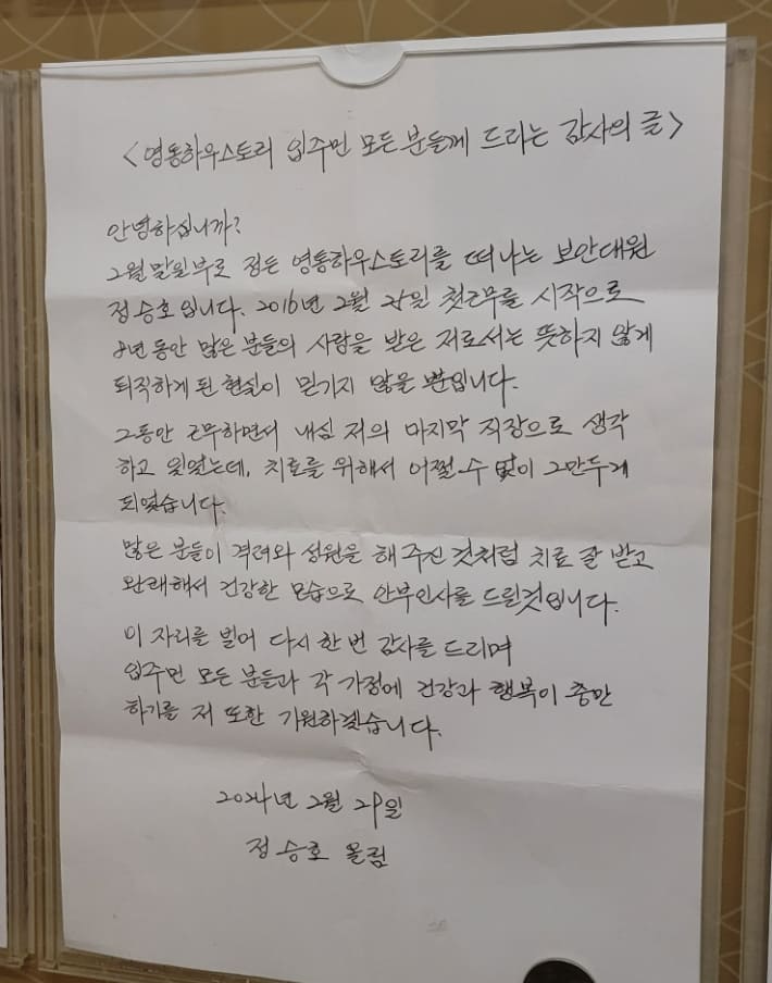 A씨는 감사문을 통해 "그동안 근무하며 내심 마지막 직장으로 생각하고 있었는데 치료를 위해 어쩔 수 없이 그만두게 됐다"며 "많은 분의 사랑을 받은 저로서는 뜻하지 않게 퇴직하게 된 현실이 믿기지 않을 뿐"이라고 썼다.