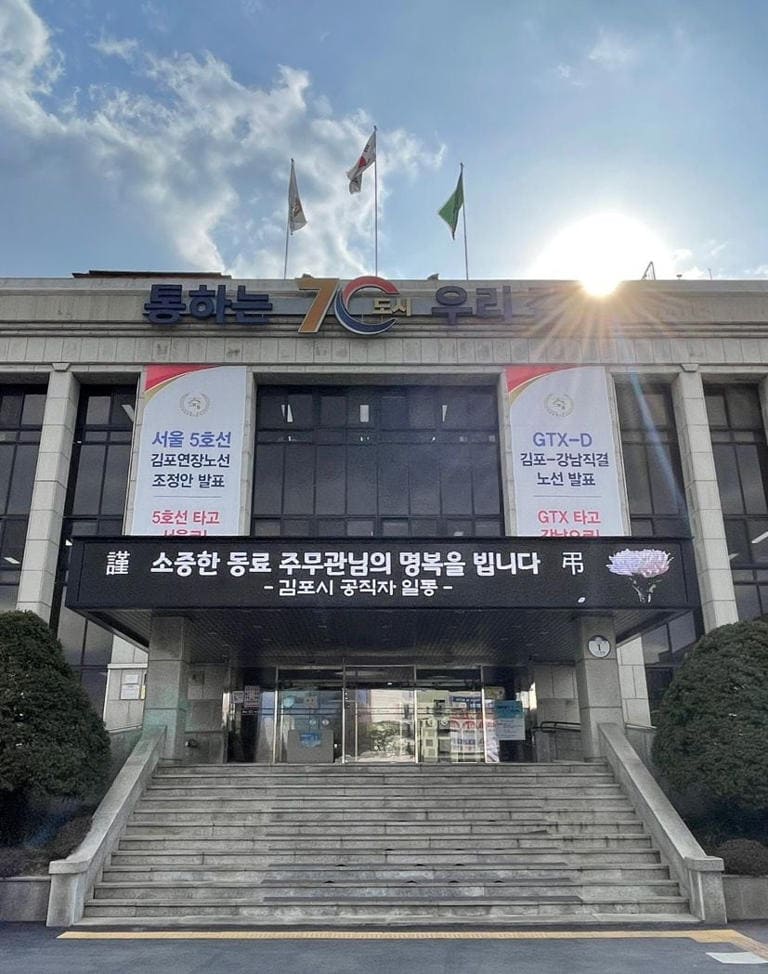 김포시는 고인에게 애도의 뜻을 전하기 위해 시청 본관 앞에 추모 공간을 마련해 오는 8일까지 운영하기로 했다.