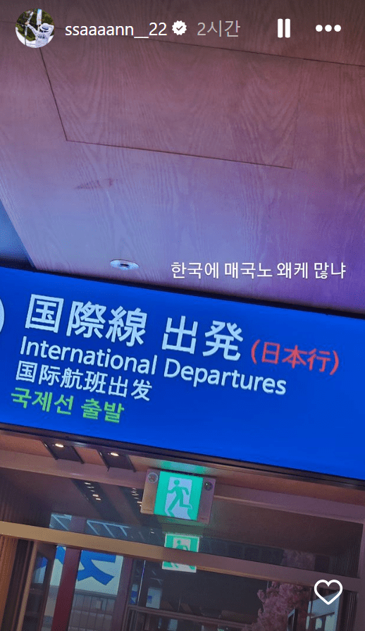 도쿄올림픽 양궁 3관왕 안산 선수는 지난 16일 인스타그램 스토리에 이런 글을 썼다. 전광판에 ‘국제선 출국(일본행)’을 뜻하는 일본식 한자 문구 ‘国際線 出発(日本行)’가 전광판에 떠 있는 사진을 함께 올렸다.