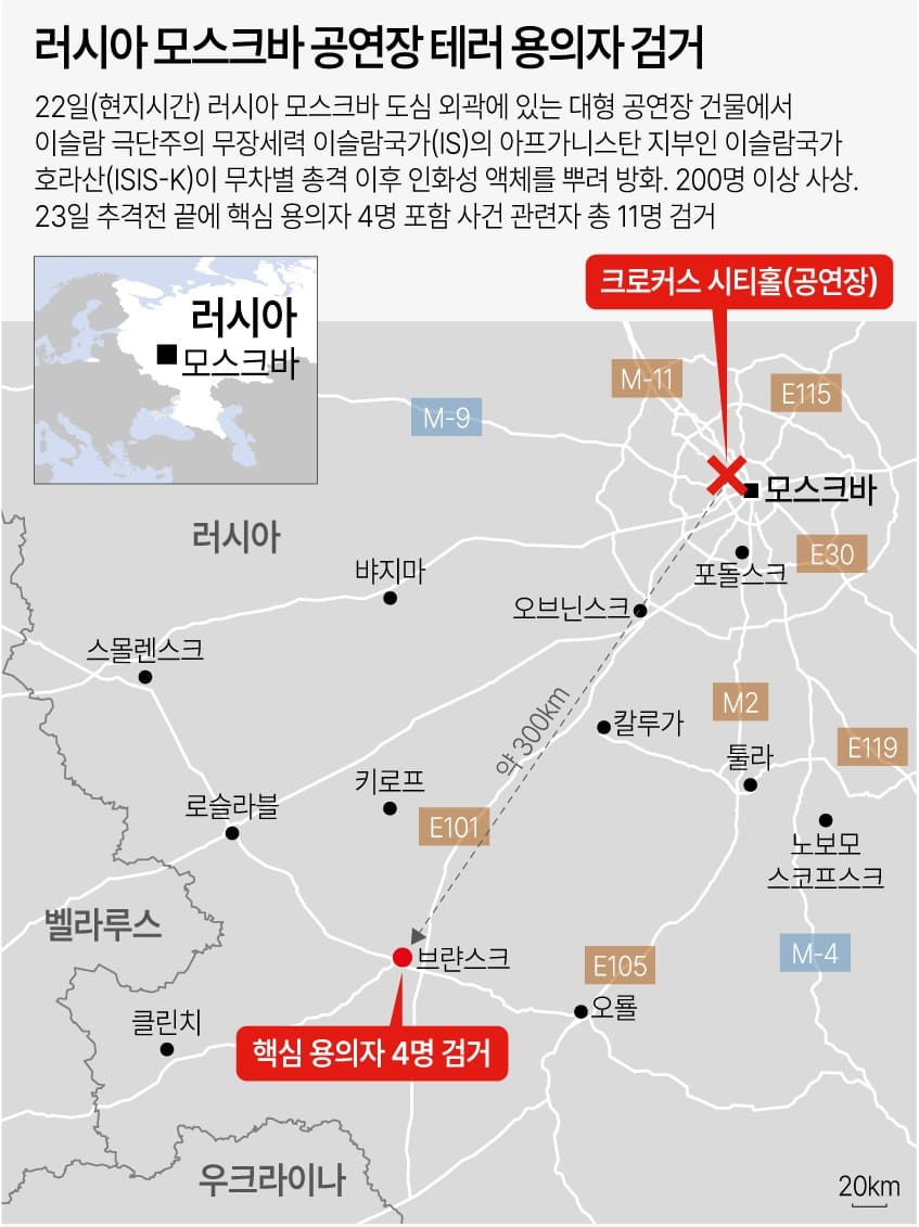 23일(현지시간) 타스·스푸트니크 통신 등에 따르면 러시아 연방보안국(FSB)은 모스크바 '크로커스 시티홀' 공연장에서 자동소총 무차별 난사로 200여 명의 사상자를 낸 핵심 용의자 4명을 포함해 관련자 총 11명을 검거했다. FSB는 블라디미르 푸틴 러시아 대통령에게 검거 상황을 보고하고 추가 공범을 찾는데 수사력을 집중하고 있다.