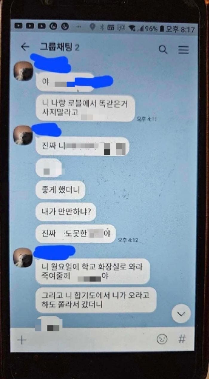 C씨는 이어 "월요일에 학교 화장실에서 죽여줄게", "너 오늘부터 왕따(집단 따돌림) 시킬 거다" 등 협박을 가했다.