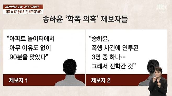 제보자는 '사건반장' 측에 "고등학교 시절 자신보다 선배였던 S 씨에게 영문도 모른 채 1시간 30분 동안 맞았고, S 씨의 남자친구가 일진이었기에 저항하지 못하고 맞을 수밖에 없었다고 주장했다. 또한 송하윤이 다른 사람과 관련한 학폭으로 강제 전학을 갔다고 말했다.