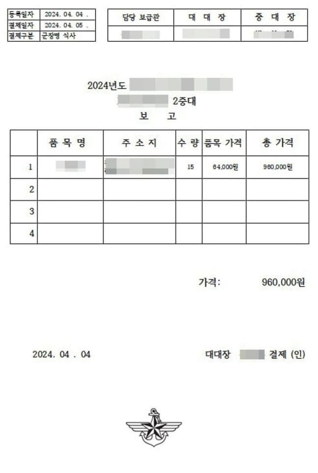 B씨는 “식사와 함께 장병이 먹을 한 달 분량의 과일도 준비해 달라”며 “전에 거래하던 농장에서는 그렇게 해줬다. 과일 농장에서 전화가 오면 그쪽에서 원하는 대로 해달라”라고 요구했다. B 씨는 대대장 직인이 찍힌 장병 식사비 결재 공문도 휴대전화로 보내기도 했다.