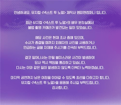 또 "해당 직원이 출입한 공연장, 직원 숙소, 사옥 등의 조사를 마쳤다"며 "추가적인 피해는 없는 것으로 파악했지만, 혹시 모를 상황에 대비해 경찰의 수사에 최대한 협조하고 관련 내용에 대해 주시하겠다"라고 덧붙였다.