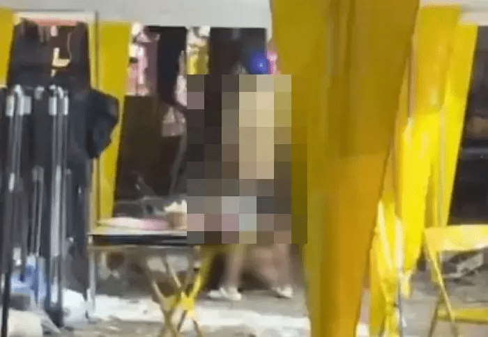 이후 파란색 모자를 쓴 남성이 일어나 엉덩이를 노출했고, 서로 자리를 바꿔 성행위를 이어갔다. 이들은 행인들을 신경 쓰지 않는 모습이었다. 잠시 뒤 이를 목격한 경비원이 두 사람을 제지했다.