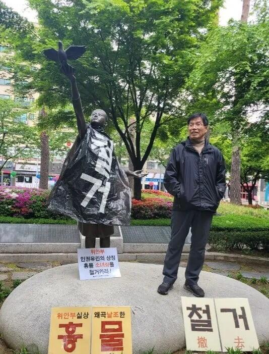 그는 '위안부 인권유린의 상징 흉물 소녀상을 철거하라!' 등의 문구가 적힌 팻말을 소녀상 앞에 세워두기도 했다.