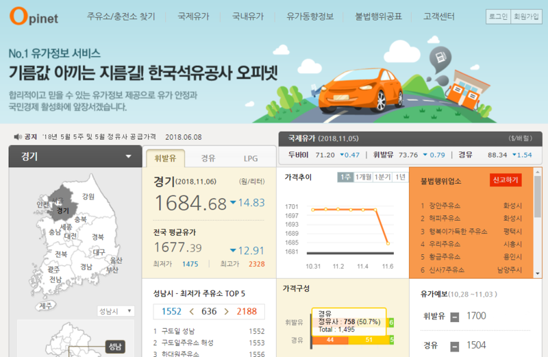 운전자라면 당연히 주유비를 줄이고 싶어 한다. 그러려면 어디 주유소가 저렴한지 알아야 한다. 그 기름 가격을 비교해주는 사이트이다. 스마트폰 어플도 있다.