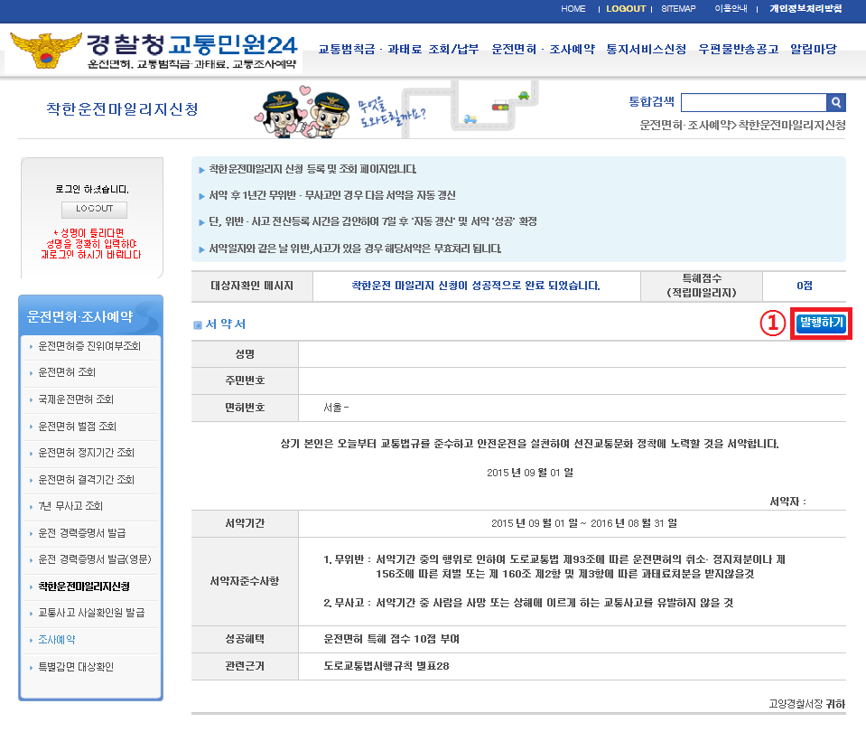 (1) 경찰청교통민원24에 먼저 로그인을 하고 운전면허 탭을 누르면 옆 메뉴에 '착한운전 마일리지 신청'이라는 메뉴를 클릭하고 신청을 하면 된다.