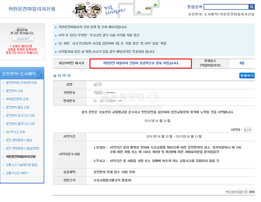 (2) 착한운전 마일리지 신청이 성공하면 이런 화면이 나온다.