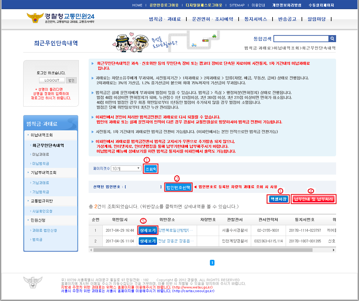 (3) 로그인을 하고 교통범칙금, 과태료 탭을 눌러서 옆의 메뉴에서 필요한 정보를 클릭하면 된다.