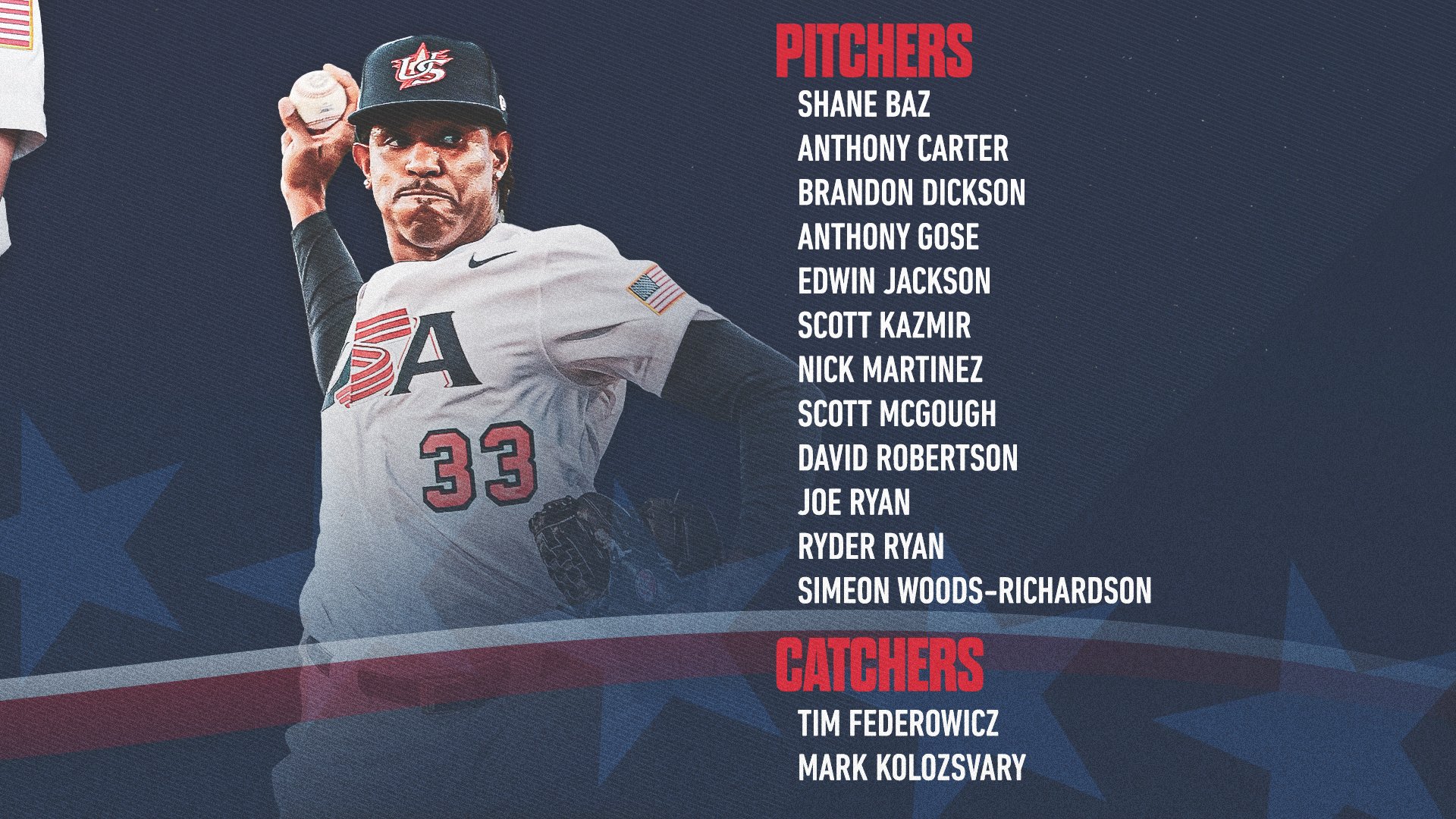투수 (12명): Shane Baz (탬파베이 레이스 AAA), Anthony Carter (Saraperos de Saltillo - LMB), Brandon Dickson (세인트루이스 카디널스 AAA), Anthony Gose (클리블랜드 인디언스 AAA), Edwin Jackson, Scott Kazmir (샌프란시스코 자이언츠 AAA), Nick Martinez (후쿠오카 소프트뱅크 호크스 - NPB), Scott McGough (도쿄 야쿠르트 스왈로스 - NPB), David Robertson, Joe Ryan (탬파베이 레이스 AAA), Ryder Ryan (텍사스 레인저스 AAA), Simeon Woods-Richardson (토론토 블루제이스 AA).