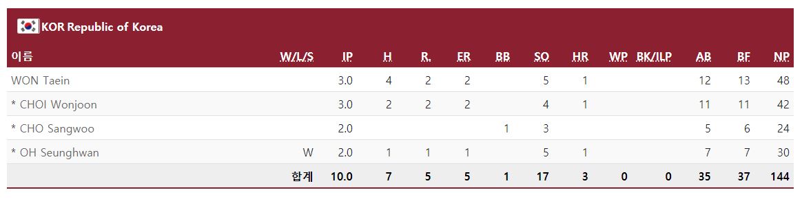 6회초 - 한국의 바뀐 최원준이 포수 라이언 라반웨이에게 2점 홈런을 맞으며 다시 역전을 당했다. 2:4