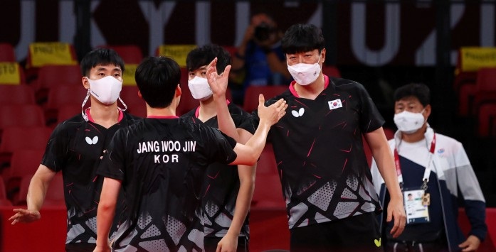 이상수, 정영식, 장우진으로 꾸려진 한국 남자 탁구 대표팀이 단체전 16강에서 슬로베니아에 3-1로 이기고 8강에 올랐다.